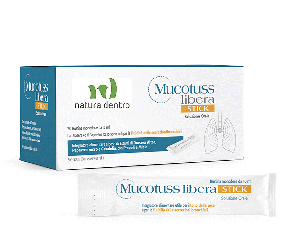 Mucotuss libera stick sciroppo monodose per il benessere della gola.